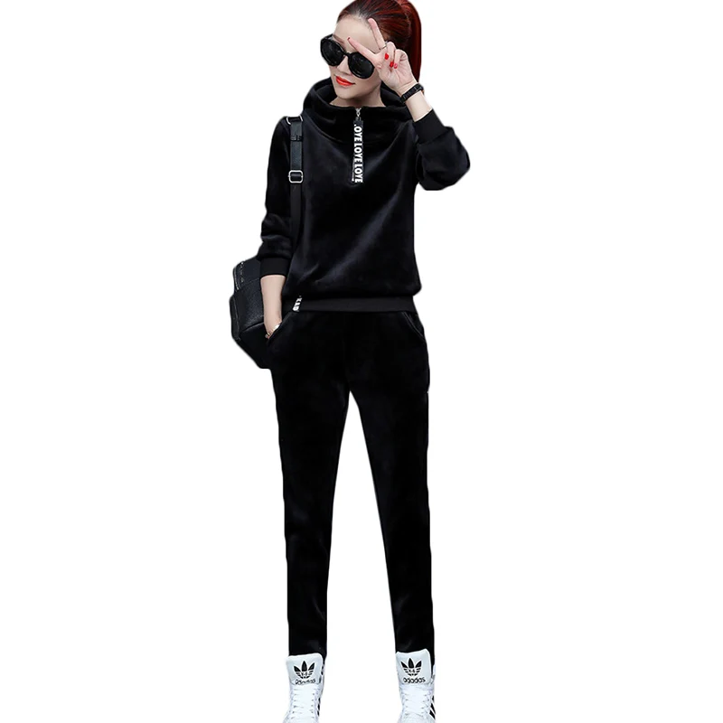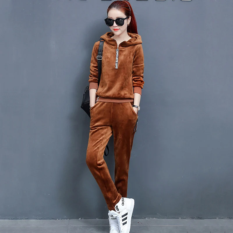 BEST QUALITY Autumn and winter new Gold velvet plus velvet sportswear suit women warm Hooded Sweater Trousers ca