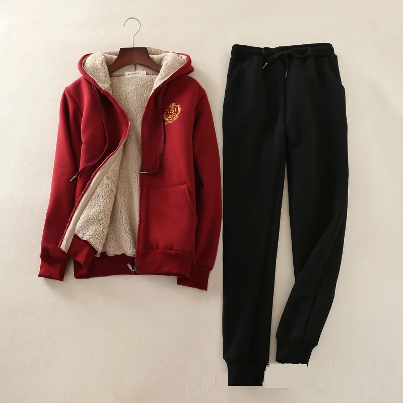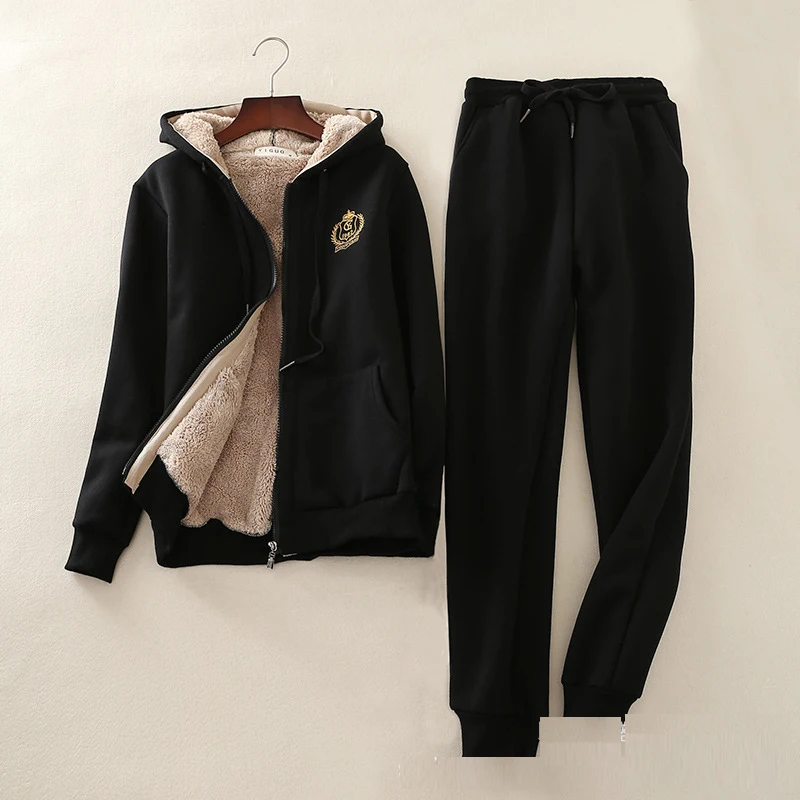 women casual winter suits Autumn 2 Piece Set Women Lamb hooded Sweatshirt+Pants Suit thick warmTrac